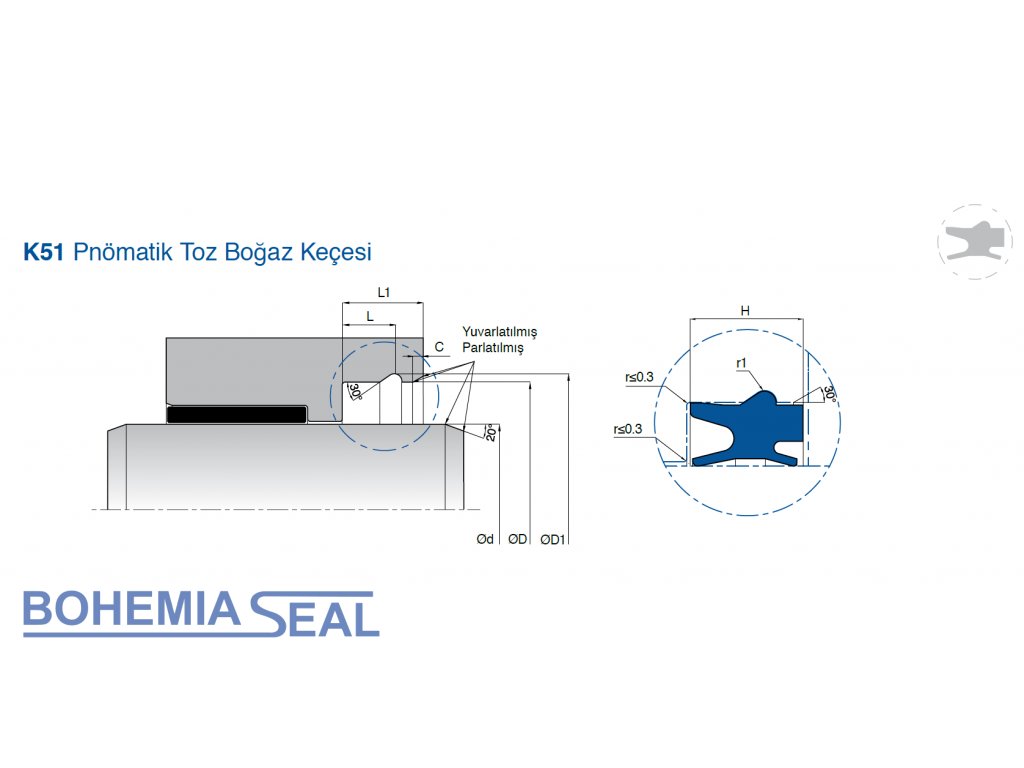 Pneumatické těsnění pístnice v kombinaci s stíracím břitem K51 je těsnicí prvek se stíracími, těsnícími vlastnostmi se speciální konstrukcí, která umožňuje montáž do otevřených drážek bez potřeby jakéhokoli pojistného kroužku.