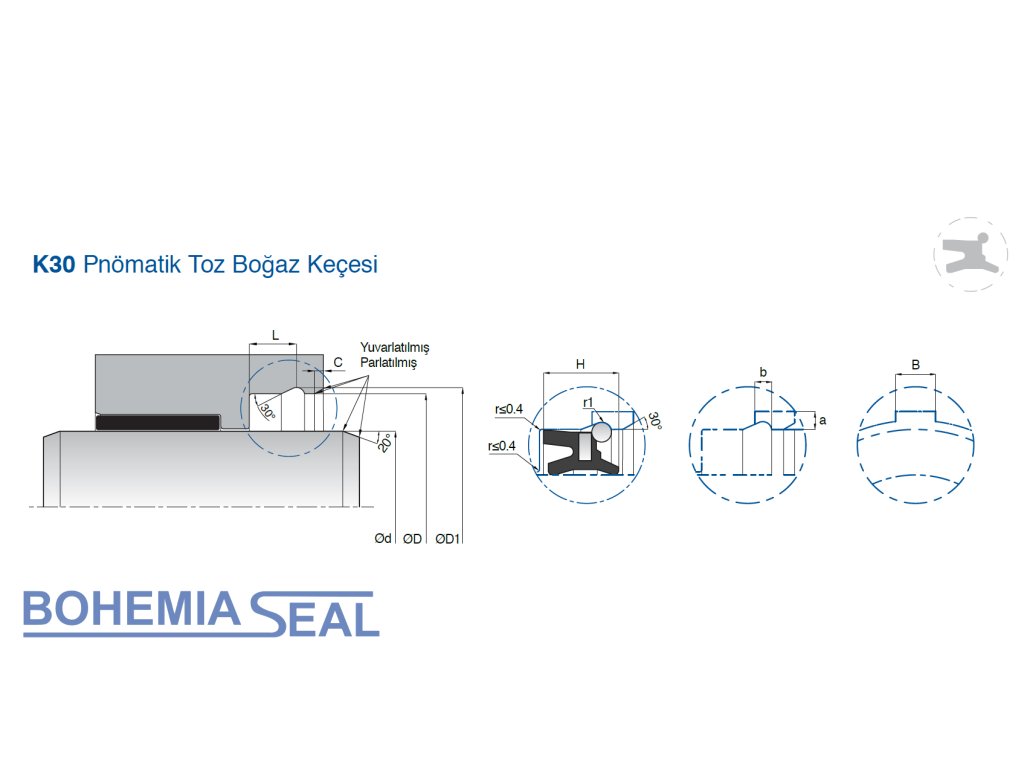 Pneumatické těsnění pístnice K30 je jednočinný těsnicí prvek kombinovaný se stíracím břitem vyrobený z elastomerového materiálu FKM a má uvnitř kovovou výztuhu pro použití v otevřených drážkách. Materiál FKM je odolný vysokým teplotám a chemikáliím.