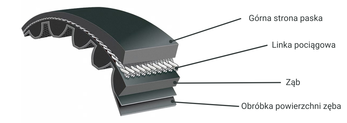 Pasy zębate należą do napędów synchronicznych – przenoszą prędkość bez poślizgu, z zachowaniem stałego przełożenia. W przeciwieństwie do pasów klinowych eliminują ryzyko poślizgu.