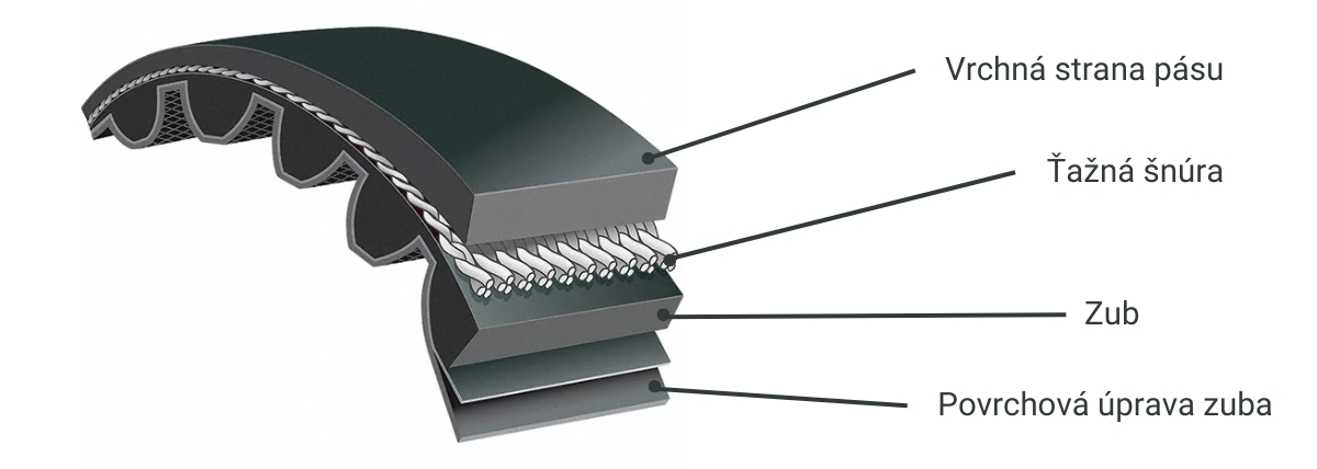 Telo pásu vrátane ozubenia je vyrobené z neoprénu (polychloroprénu) alebo polyuretánovej zmesi. Neoprénové pásy zvyčajne obsahujú sklenené vlákna, zatiaľ čo polyuretánové pásy sú zvyčajne vystužené oceľovými vláknami.