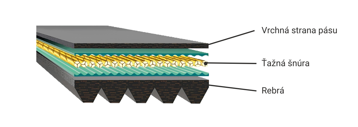 Rebrované pásy sa skladajú z troch vrstiev - vrchná strana pásu je zvyčajne vyrobená z polychloroprénovej gumovej zmesi odolnej proti opotrebovaniu. Jadro tvorí ťahová šnúra, čo je polyesterová ťahová šnúra s nízkou pružnosťou obalená lepiacou gumovou zmesou. Spodná strana pásu je vybavená klinovitými rebrami vyrobenými z gumovej zmesi odolnej proti opotrebovaniu.