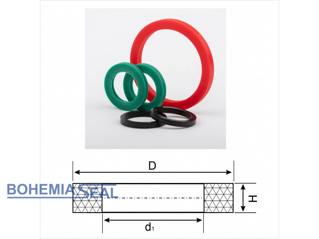 R-krúžky sa definujú vnútorným priemerom (d1), vonkajším priemerom (D) a hrúbkou (H).