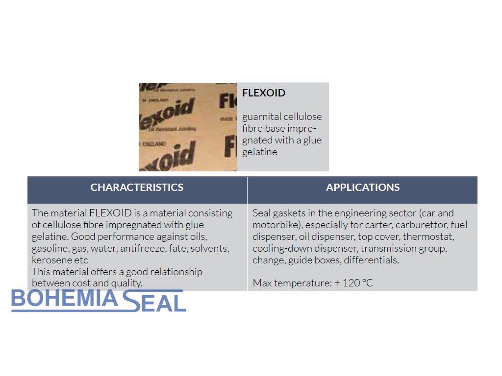 Těsnicí papír FLEXOLIE G (materiál FLEXOID) je materiál skládající se z celulózového vlákna impregnovaného lepicí želatinou.
