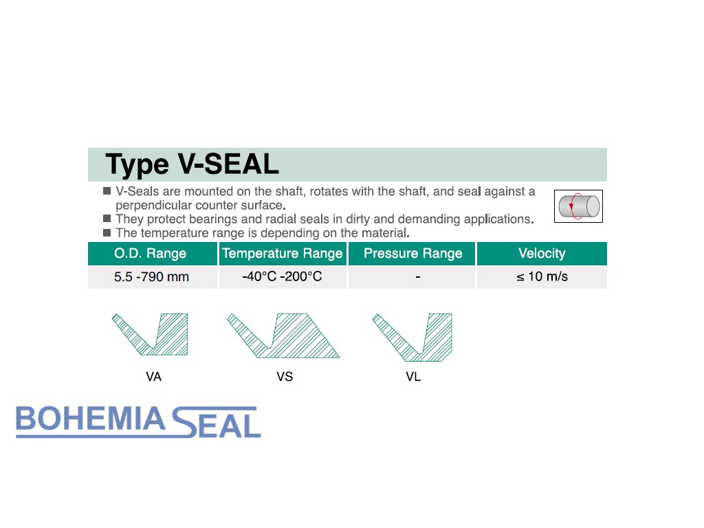 V-kroužky jsou axiální těsnění připevněné pružností k hřídeli, těsnící břit těsní proti kolmé zástavbě. Velmi často slouží k utěsnění ložisek a primárních těsnění v prašných plikacích. Teplotní rozsah použití V-kroužků je dán použitým materiálem, NRB do 100°C , FKM do 200°C.