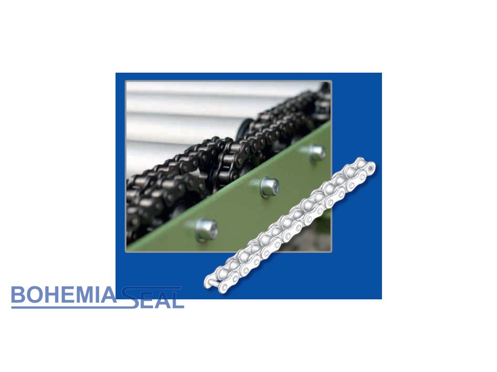 Válečkový řetěz se skládá z válečků, čepů, pouzder a vnějších a vnitřních destiček. Je zkontruován pro přenos síly, kde použité materiály z ušlechtilé oceli dovolují vysoké maximální zatížení.